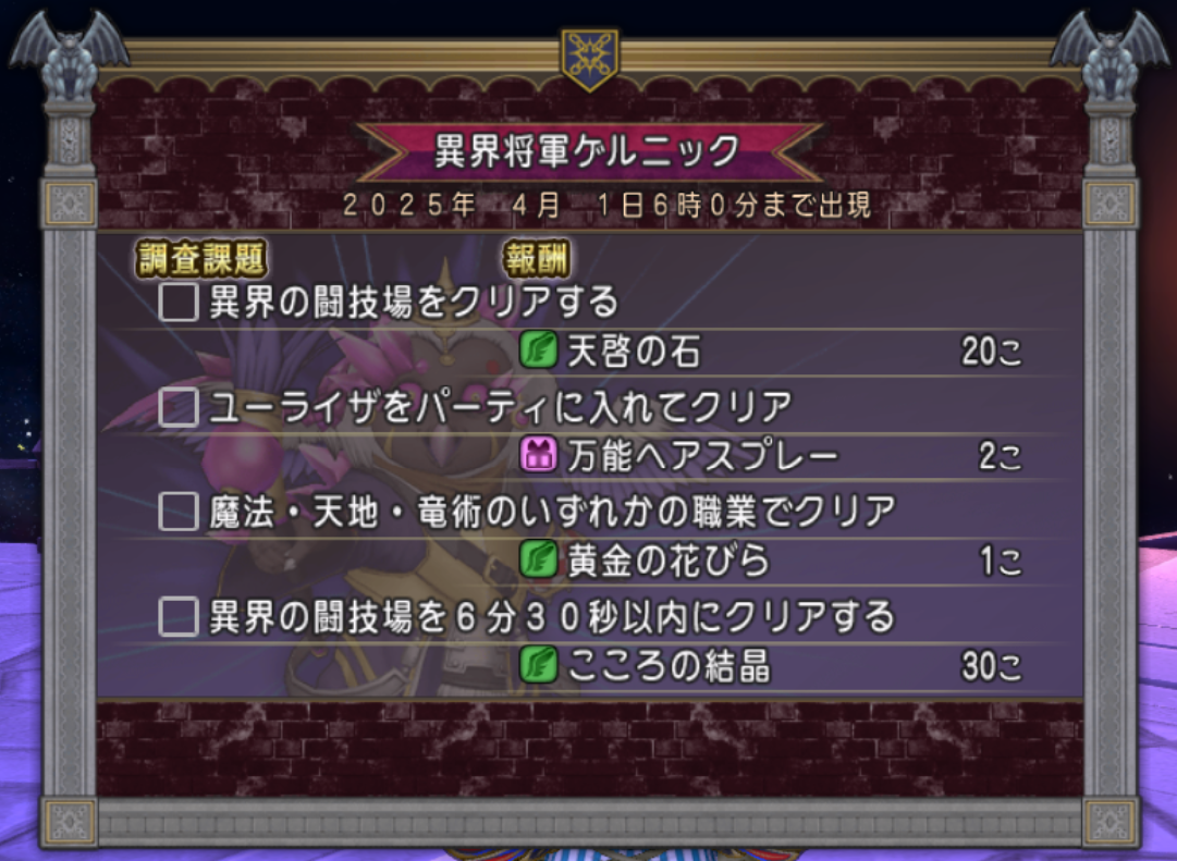 異界の闘技場の中では比較的戦いやすい対戦相手の異界将軍ゲルニックです。ユーライザが育っていれば一気に全てのお題もクリアできそうです。