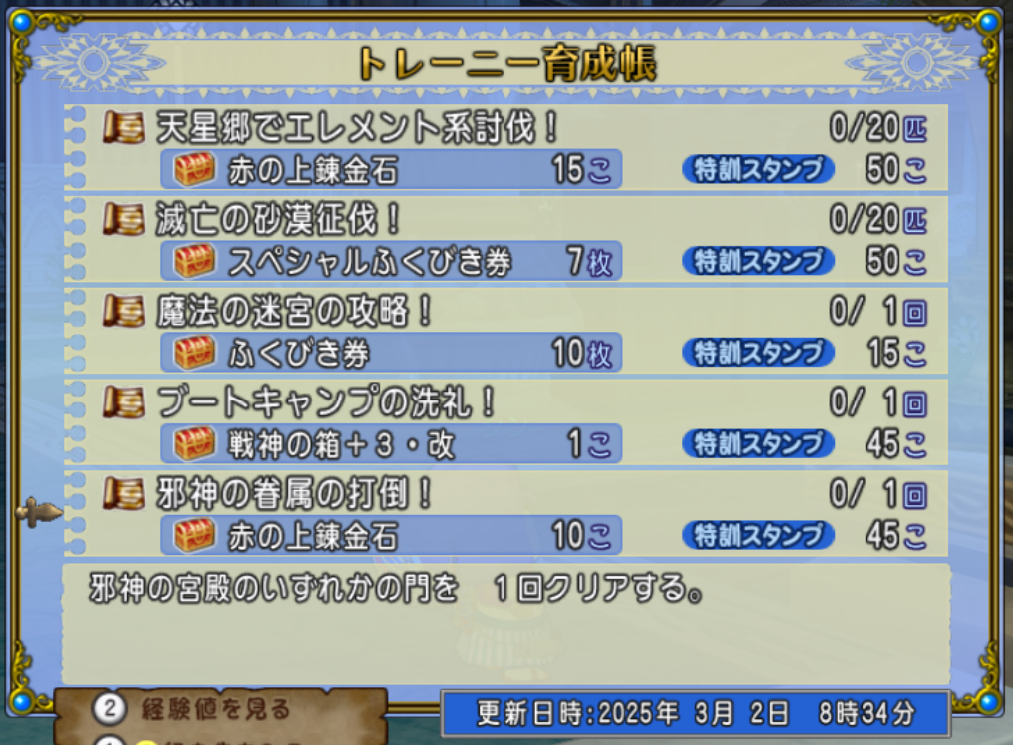 邪神の宮殿・天獄は2日朝現在で全点滅一歩手前の状況です。今週のトレーニー育成帳のお題(錬金石が報酬)に邪神の宮殿が登場したので点滅状態が進みそうです。近日中に開放の可能性もありそう!