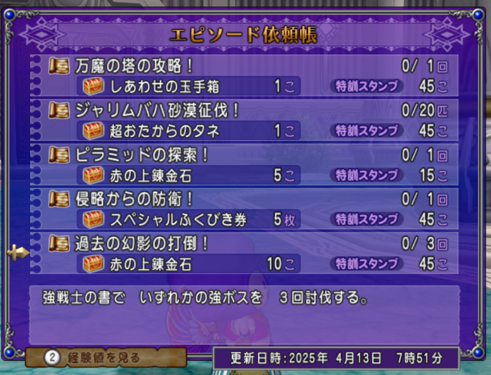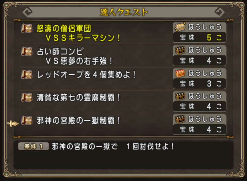 4個報酬ですが「邪神の宮殿の一獄制覇!」はトレーニー育成帳のお題とも重複しているので個人的にオススメのお題です!