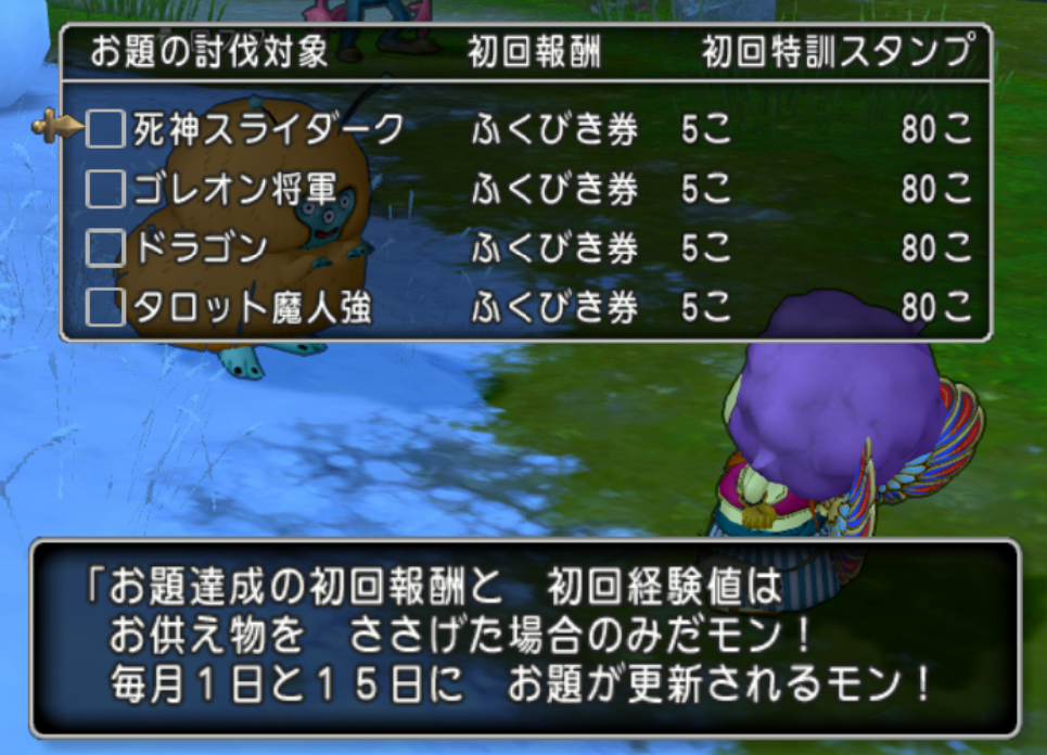 本日4月15日(火曜日)は黄昏の奏戦記の報酬、モコモコハウス・ロスターさんのお題、レモンスライムクイズの報酬の更新日です。