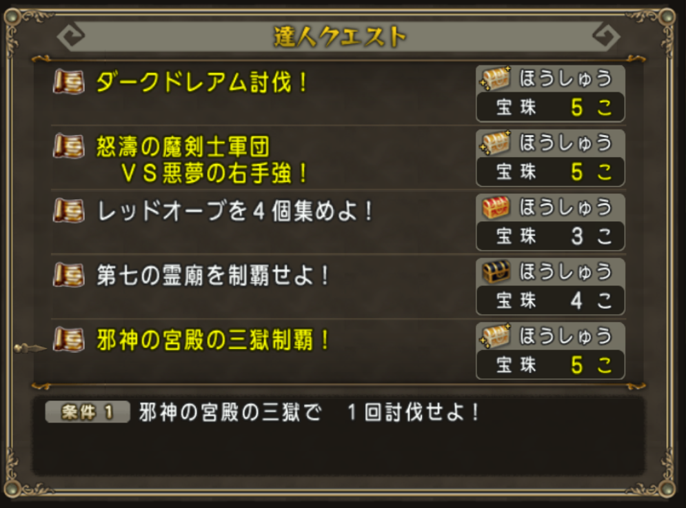 5個報酬「邪神の宮殿の三獄制覇!」はトレーニー育成帳(報酬は錬金石!)と重複しているので、今週はこちらのお題がオススメです!