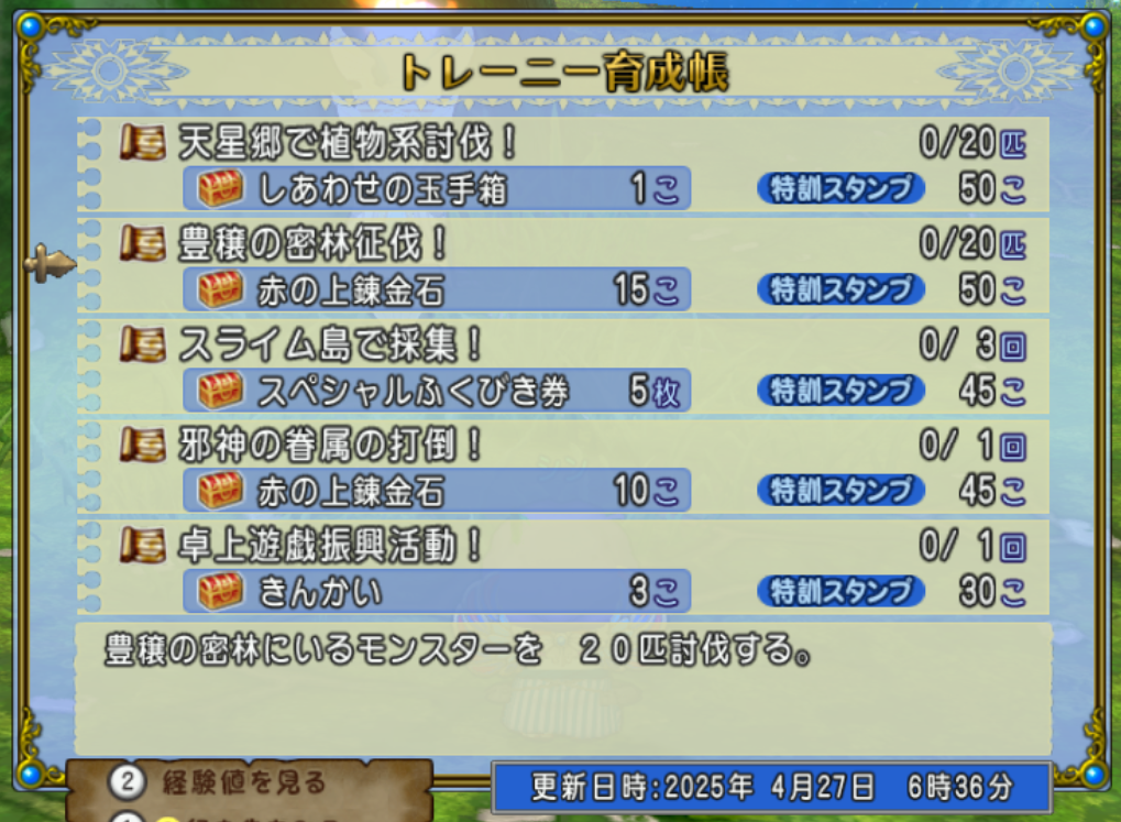 豊穣の密林には「黒ごまキッズ」「オベルジーヌ」などの植物系モンスターが生息しているので「豊穣の密林征伐!」「天星郷で植物系討伐!」を併せてクリアするのがオススメです。