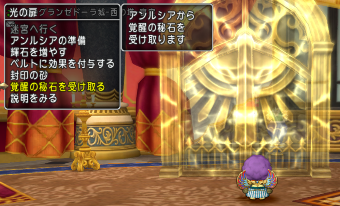 グランゼドーラ城・光の扉(王家の迷宮の入口)で覚醒の秘石を受け取る事ができました。 今後は毎月10日にリセットされて入手できるようになります。