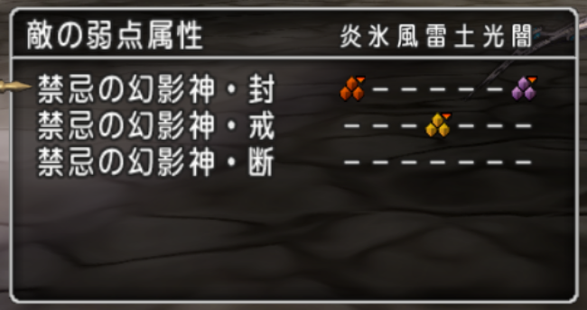 「禁忌の幻影神・戒」「禁忌の幻影神・封」「禁忌の幻影神・断」の3体との戦いになります。