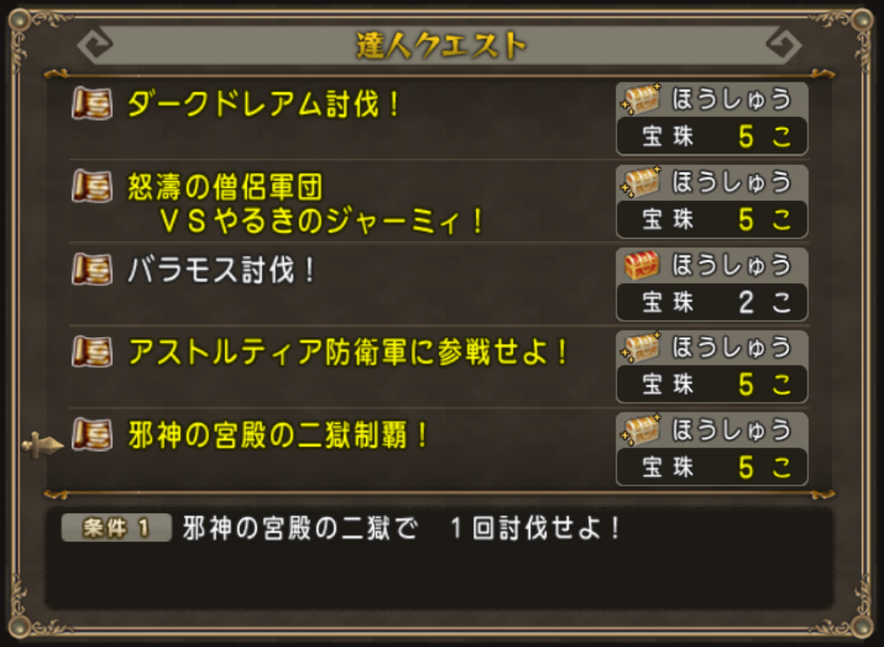 トレーニー育成帳&達人クエストに邪神の宮殿関連のお題があるので、それらを受注してから参加したいです。