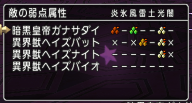 HPが少し減る(ガナサダイの名前は白のまま)と「異界獣ヘイズバット」「異界獣ヘイズナイト」「異界獣ヘイズバイオ」が登場します。(4人PTで挑んだ場合はランダム?で1体登場します)