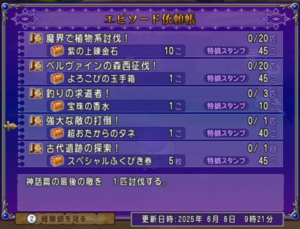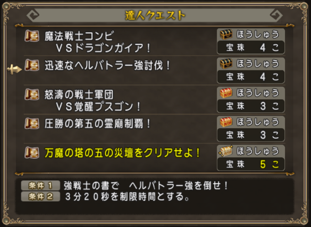 悩ましいところです。万魔の塔に行かれている方は5個報酬「万魔の塔の五の災壇をクリアせよ!」が良さそうです。
