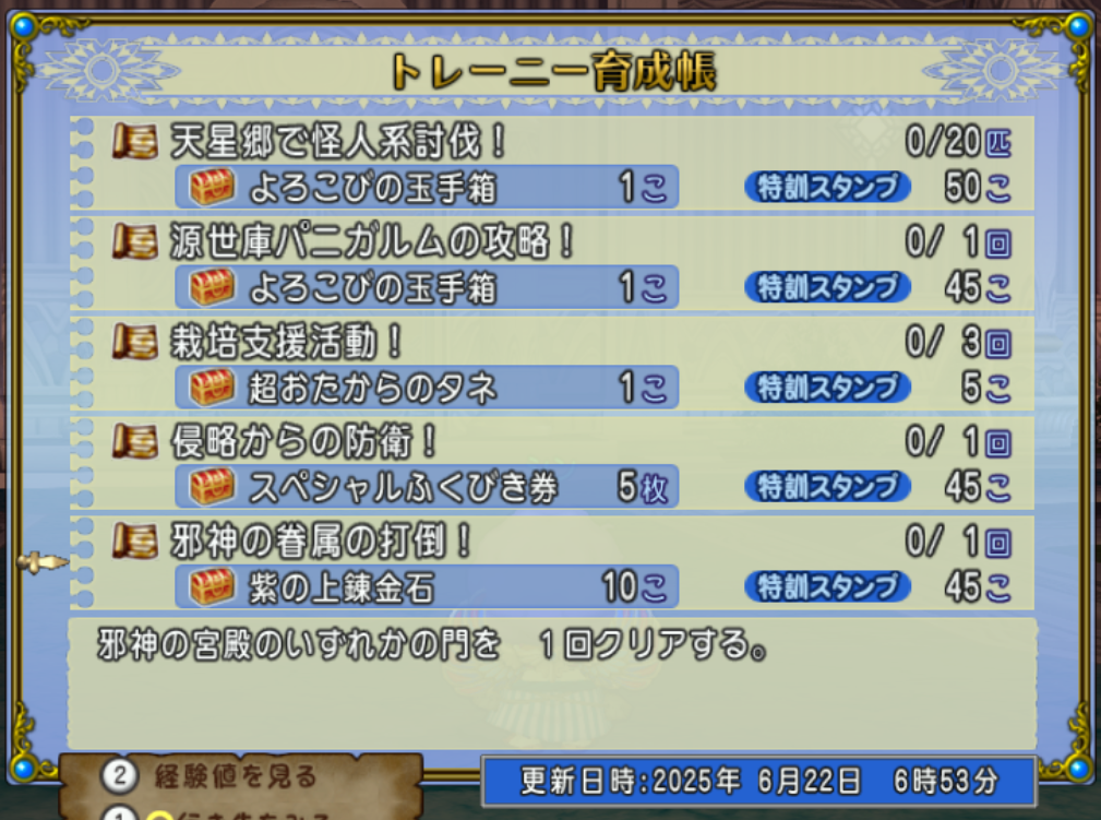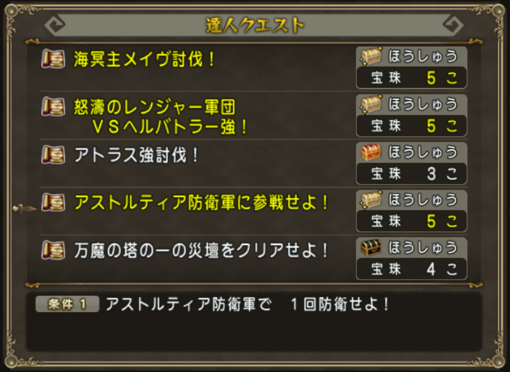 5個報酬「アストルティア防衛軍に参戦せよ!」はトレーニー育成帳のお題とも重複しているので、このお題と併せてクリアするのが良さそうです。