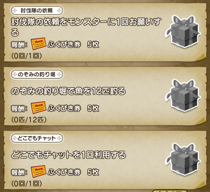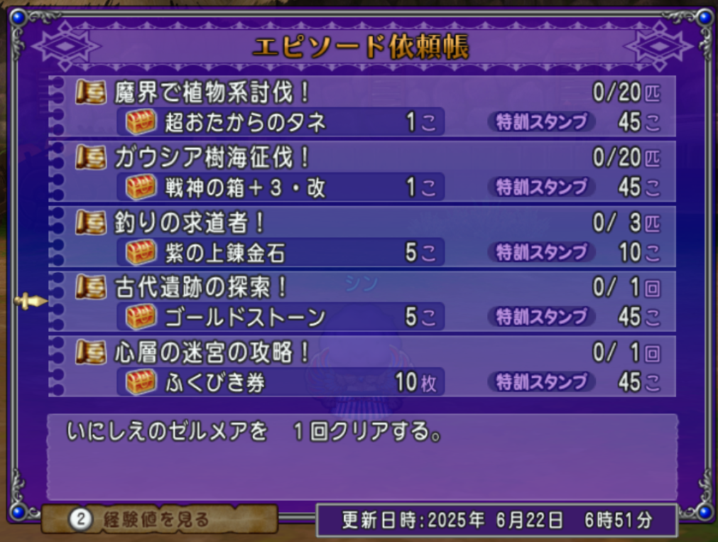 「のぞみの釣り堀で魚を12匹釣る」のお題はエピソード依頼帳のお題とも重複しているので(しかも報酬は錬金石!)エピソード依頼帳の更新後にクリアしたいところです。
