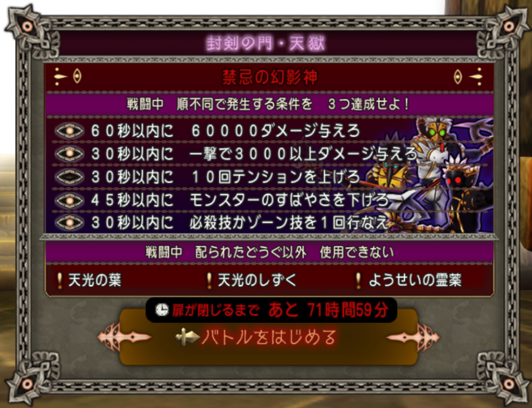 ということで、今日は天獄からのスタートで協力チャレンジバトル&パニガルムに遊びに行きたいと思います。もちろんバザーチェックをして「しぐさ書・おおかみだぞ」入手を企みますが(笑)
