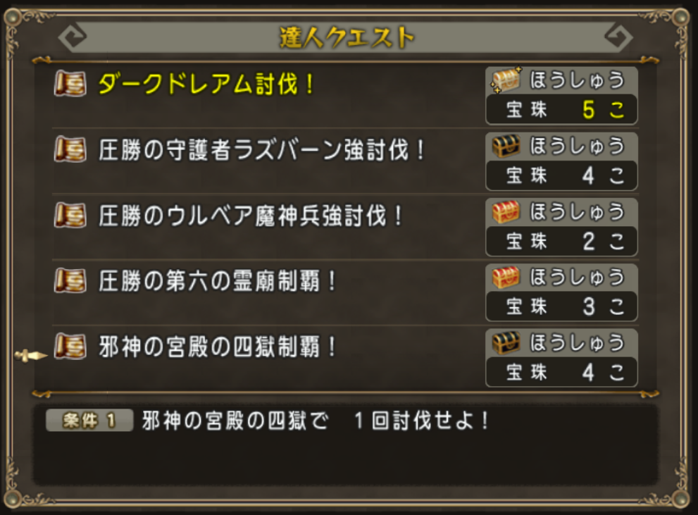 4個報酬ですが「邪神の宮殿の四獄制覇!」を受注しておけば10日の邪神の宮殿の更新日に自動的にクリアできそうです。