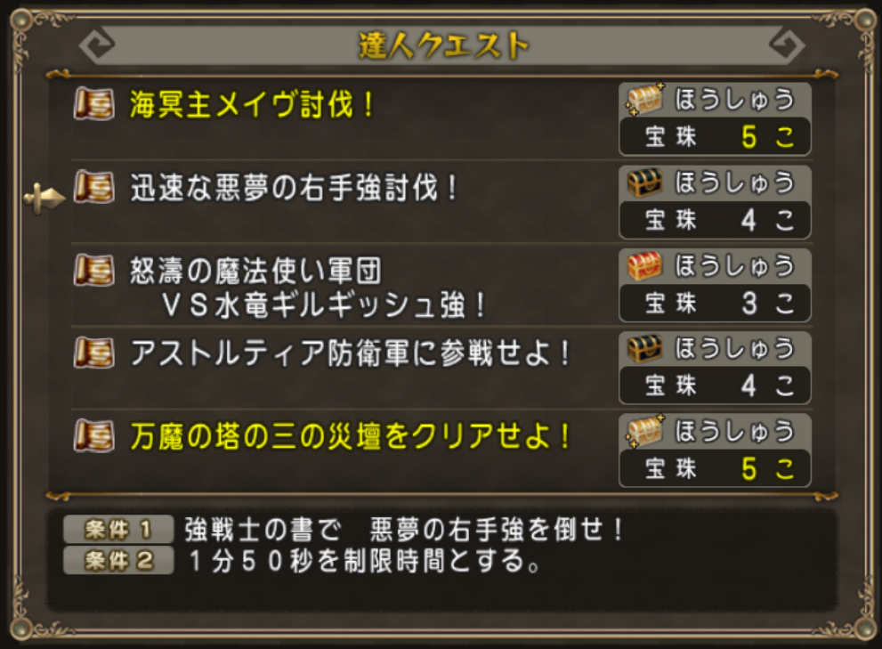 サクッとクリアしたい場合は4個報酬ですが「迅速な悪夢の右手強討伐!」がオススメです。
