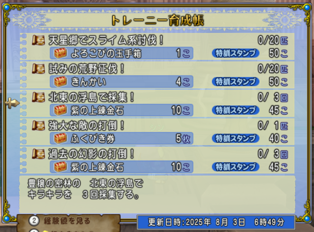 「北東の浮島で採集!」はキラキラを拾うとクリアできるのですが、キラキラポイントは意外と見つけにくいので盗賊「おたからさがし」海賊「レミラーマ」などを上手く活用していきたいです。