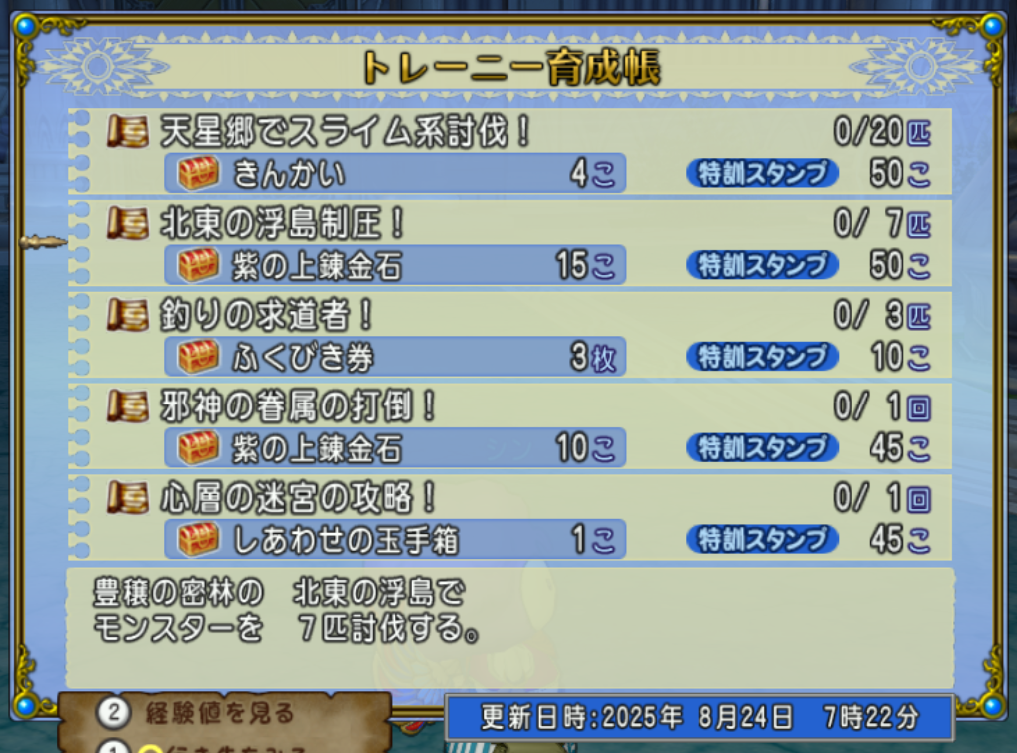 今週分の週課の報酬をバージョンアップ後に受け取りたい方は受注&クリアのみ進めて、報告だけ好きなタイミングでするのが良さそうです。