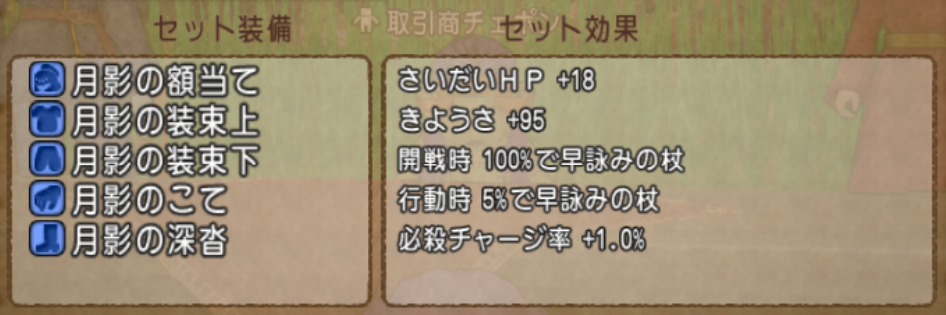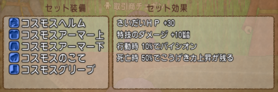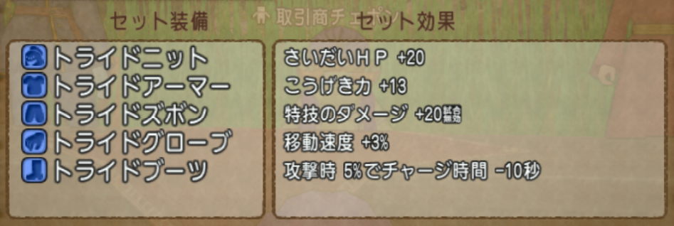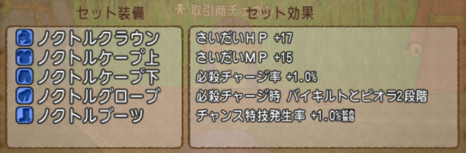 セット効果 : 必殺チャージ率+1%、必殺チャージ時バイキルト&ピオラ2段階、チャンス特技発生率+1%