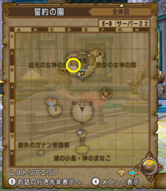 バージョン7.5で追加されたクエスト「とこしえの語り部 散る花 咲く花」(クエストNo.829 メインストーリークリア後限定?)を進めていくと、画像の〇で囲っている「威光の女神の間」に入る事ができるようになります。