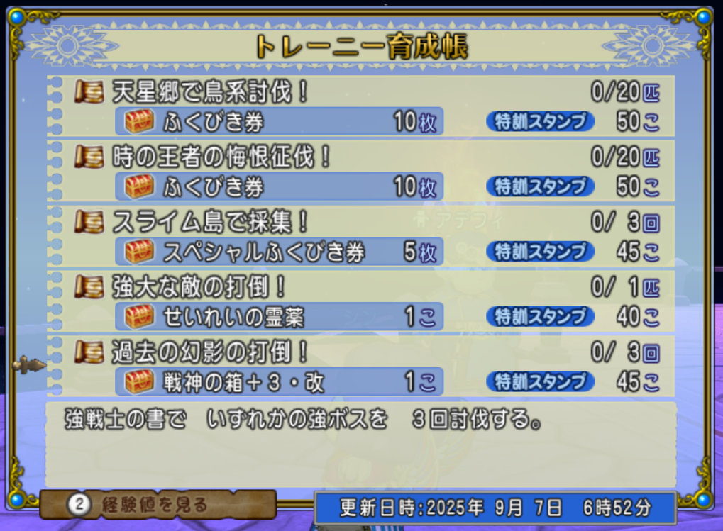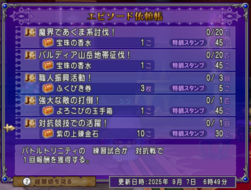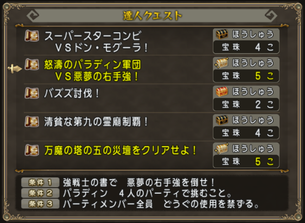 ついでのある方は「清貧な第九の霊廟制覇!」「万魔の塔の五の災壇をクリアせよ!」も良さそうです。