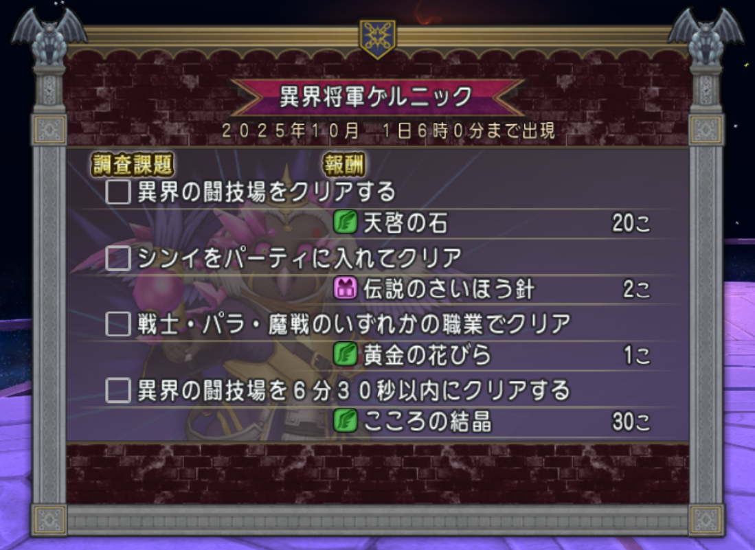どれも貴重な報酬なので忘れずに受け取っておきたいです。(特に異界将軍ゲルニックは対策の取りやすい対戦相手ですし!)