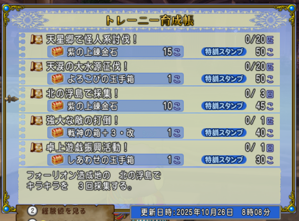 錬金石が報酬のお題は「天星郷で怪人系討伐!」「北の浮島で採集!」です。