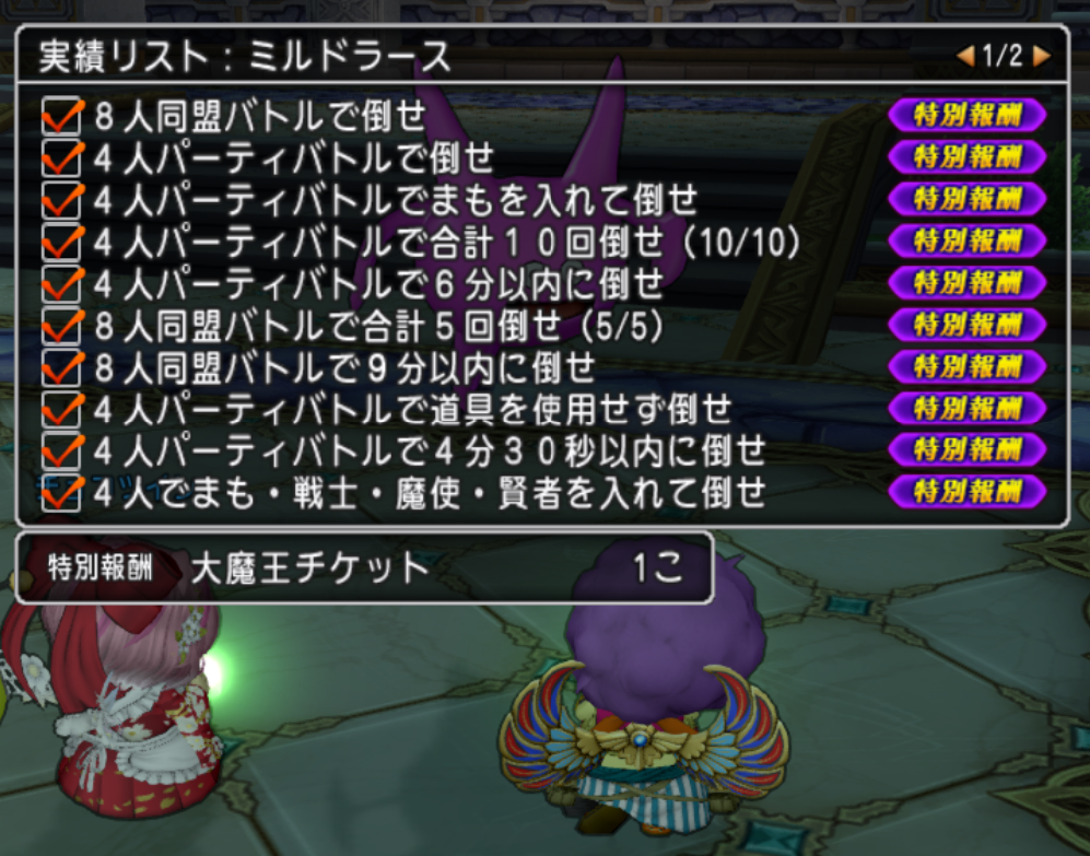今回の伝説の宿敵たちに追加された実績は画像の通りミルドラースの5つです。