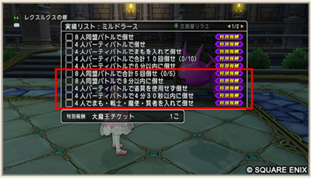 特に難しいのは「4人PTバトルで4分30秒以内に倒せ」「4人PTでまも・戦士・魔使・賢者を入れて倒せ」です。(個人的には「8人同盟バトルで9分以内に倒せ」も難しく感じましたが)