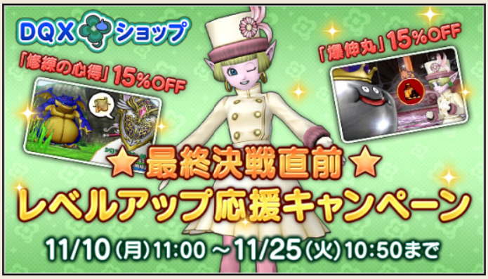 現在DQⅩショップでは「最終決戦直前 レベルアップ応援キャンペーン」が開催されています。