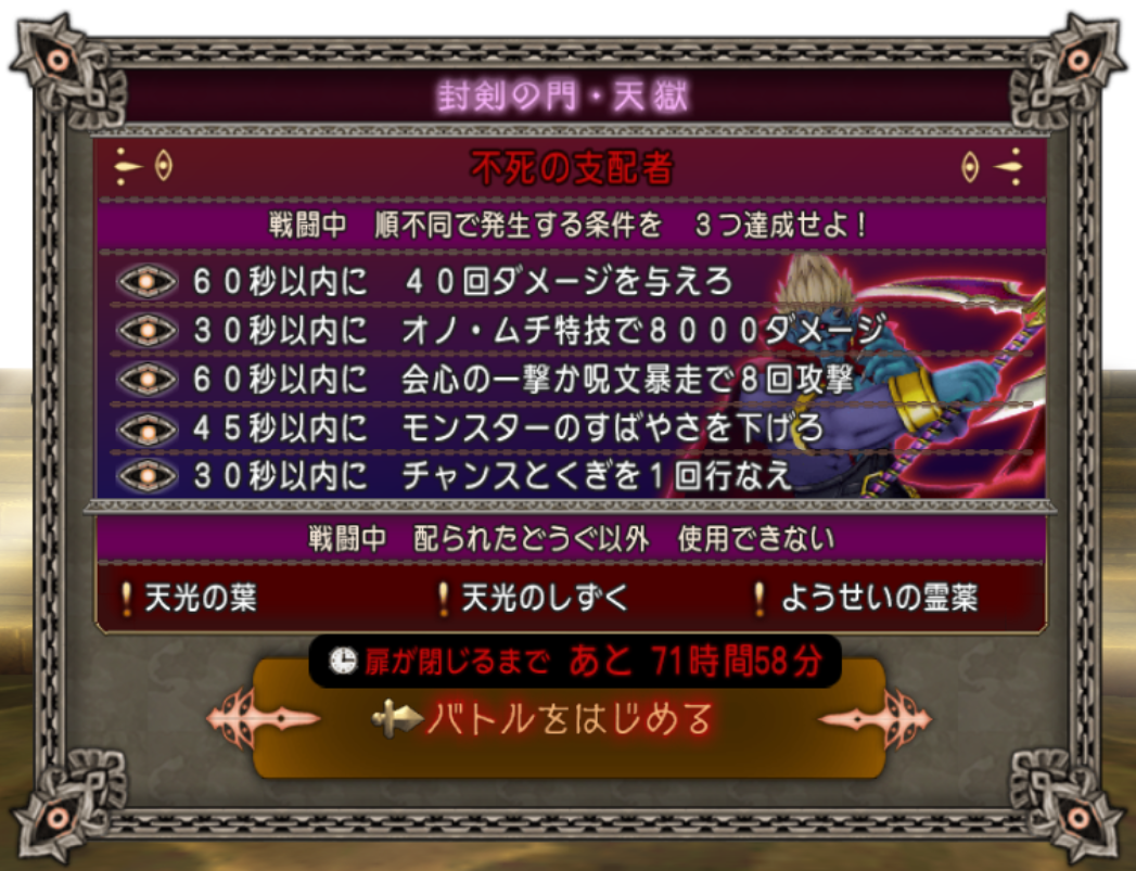 「オノ・ムチ特技で8000ダメージ」「モンスターのすばやさを下げろ」は条件をクリアできる職業が限定されるので、アタッカーで挑戦する際にはこのあたりを意識した職業で行くのが良さそうです(例:ムチ盗賊など)