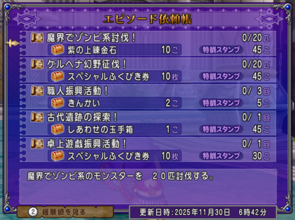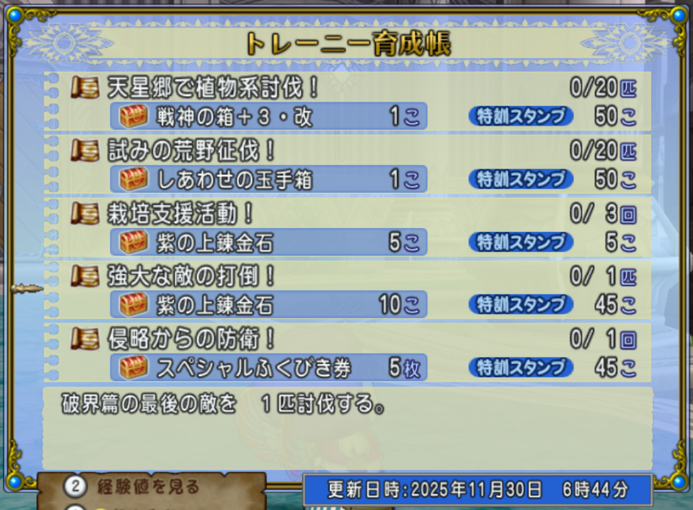 レンダーシア討伐、トレーニー育成帳、エピソード依頼帳、達人クエストはクリアだけして報告はバージョンアップ後に、という流れが良さそうです。