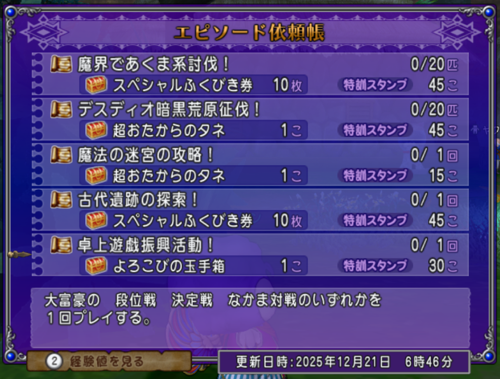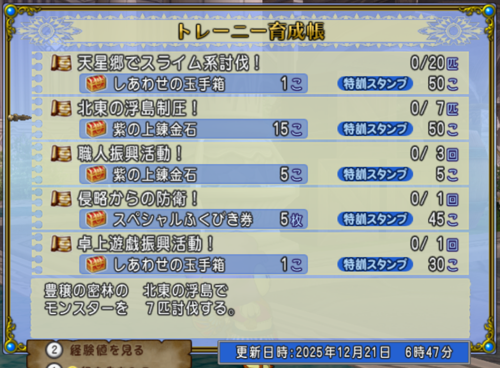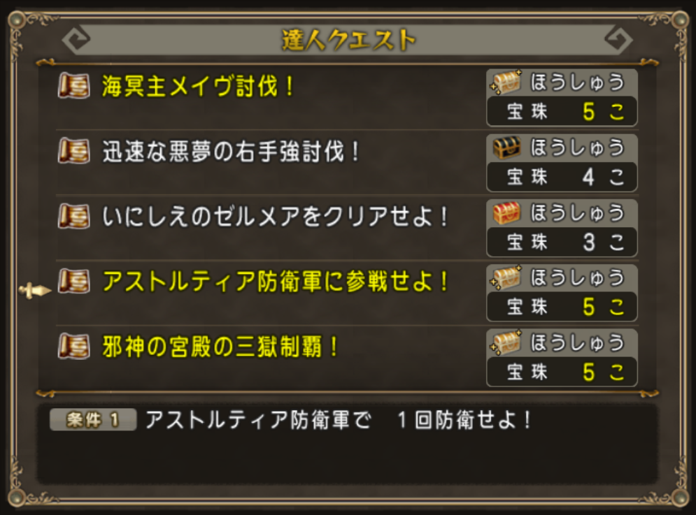 「アストルティア防衛軍に参戦せよ!」はトレーニー育成帳にもお題がありますし、狙い目かもしれません(僕はこちらをクリアする予定です)
