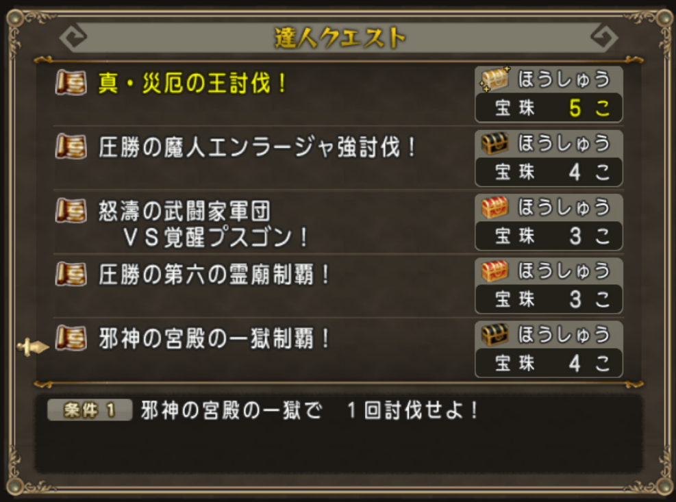 また今週の達人クエストに邪神の宮殿のお題(4個報酬ではありますが)があるので邪神の宮殿に行かれる前にチェックしておきたいところです。