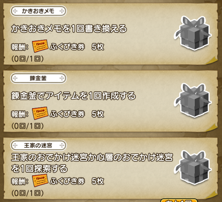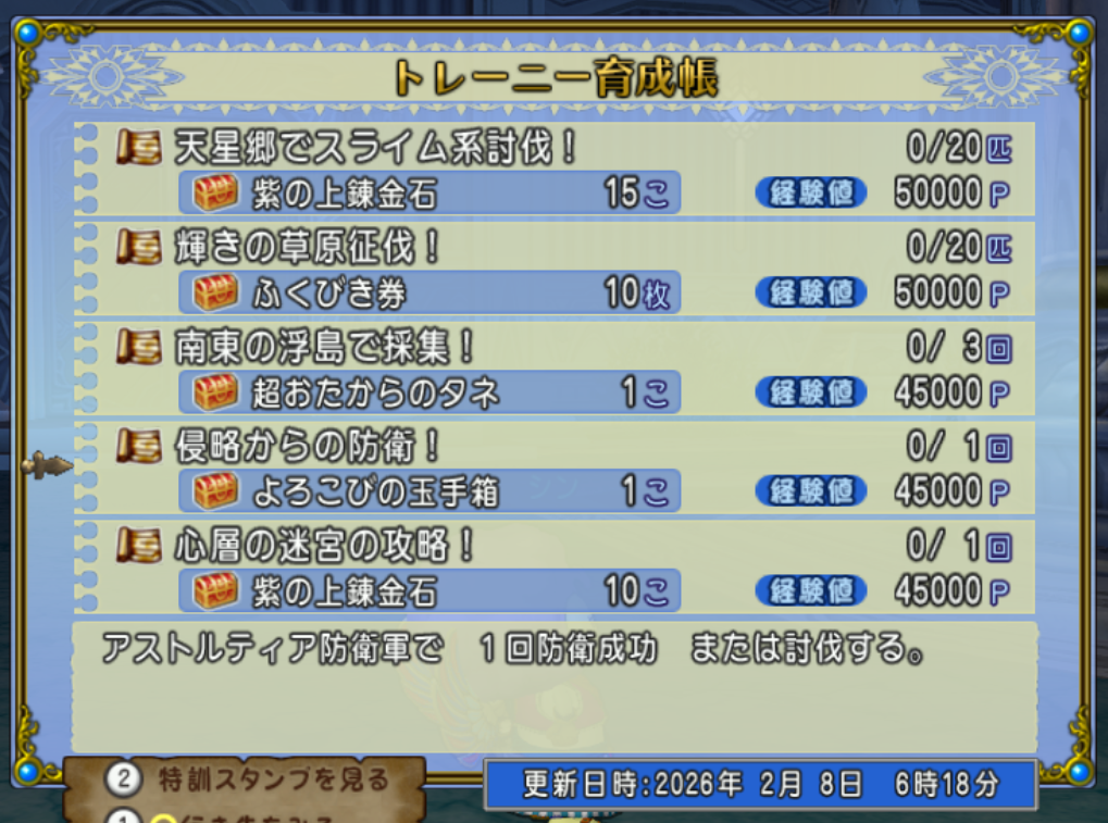 「王家のおでかけ迷宮か心層のおでかけ迷宮を1回探索する」を進める前にトレーニー育成帳を更新してダブルクリアを狙いたいです!