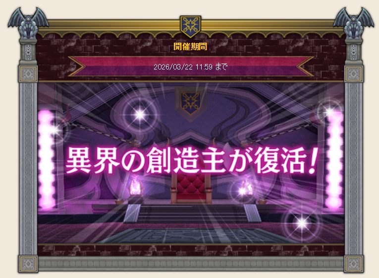 異界の創造主は現在開放中、フェスタ・インフェルノは一昨日まで開催されていたので来週の開催の可能性は低そうです。これらのコンテンツはバージョンアップ直後は開放サイクルが長くなる傾向もあるのでしばらく開放されづらい可能性も!?