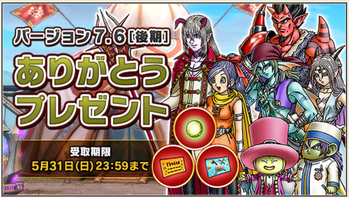 冒険者の広場で「バージョン7.6ありがとうプレゼント」が配布されています。