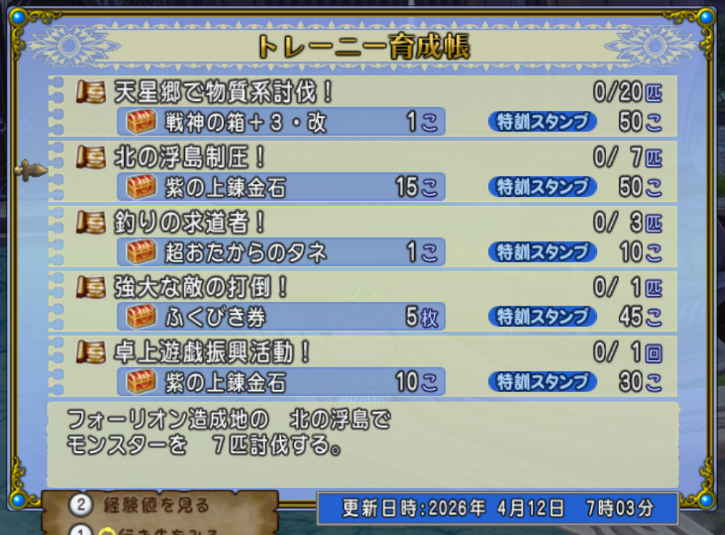 錬金石が報酬のお題は「北の浮島制圧!」「卓上遊戯振興活動!」です。